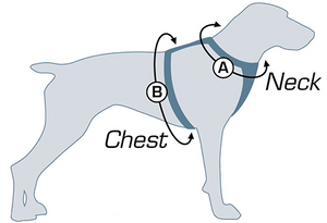 | Size | Neck (A) | Chest (B) | Dog Weight |