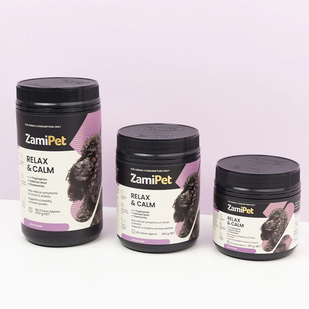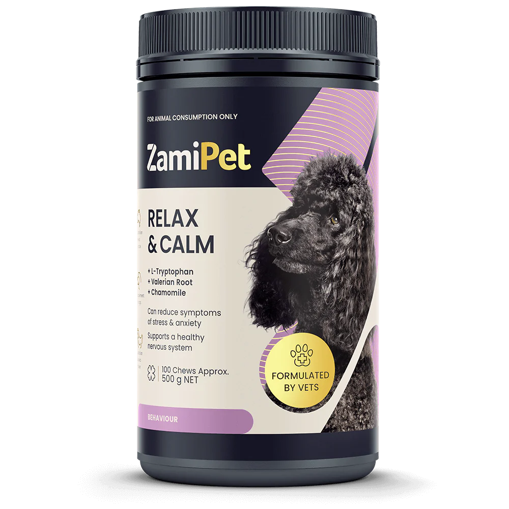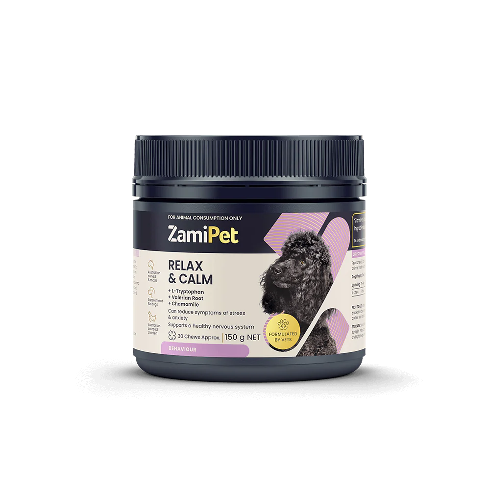 ZamiPet Relax & Calm is a superior calming chew designed to support a healthy nervous system and reduce symptoms of stress and anxiety in dogs, without causing drowsiness. Formulated with a blend of natural ingredients like L-Tryptophan, Valerian Root, Chamomile, L-Theanine, and Magnesium Citrate, this supplement helps manage and alleviate anxiety during various stressful situations such as thunderstorms, fireworks, travel, vet visits, and more. More than 70% of dogs in Australia show signs of anxiety, and ZamiPet’s carefully crafted formula provides a non-drowsy solution to help your dog cope in a calming and healthy way, enhanced with delicious Australian chicken for palatability.